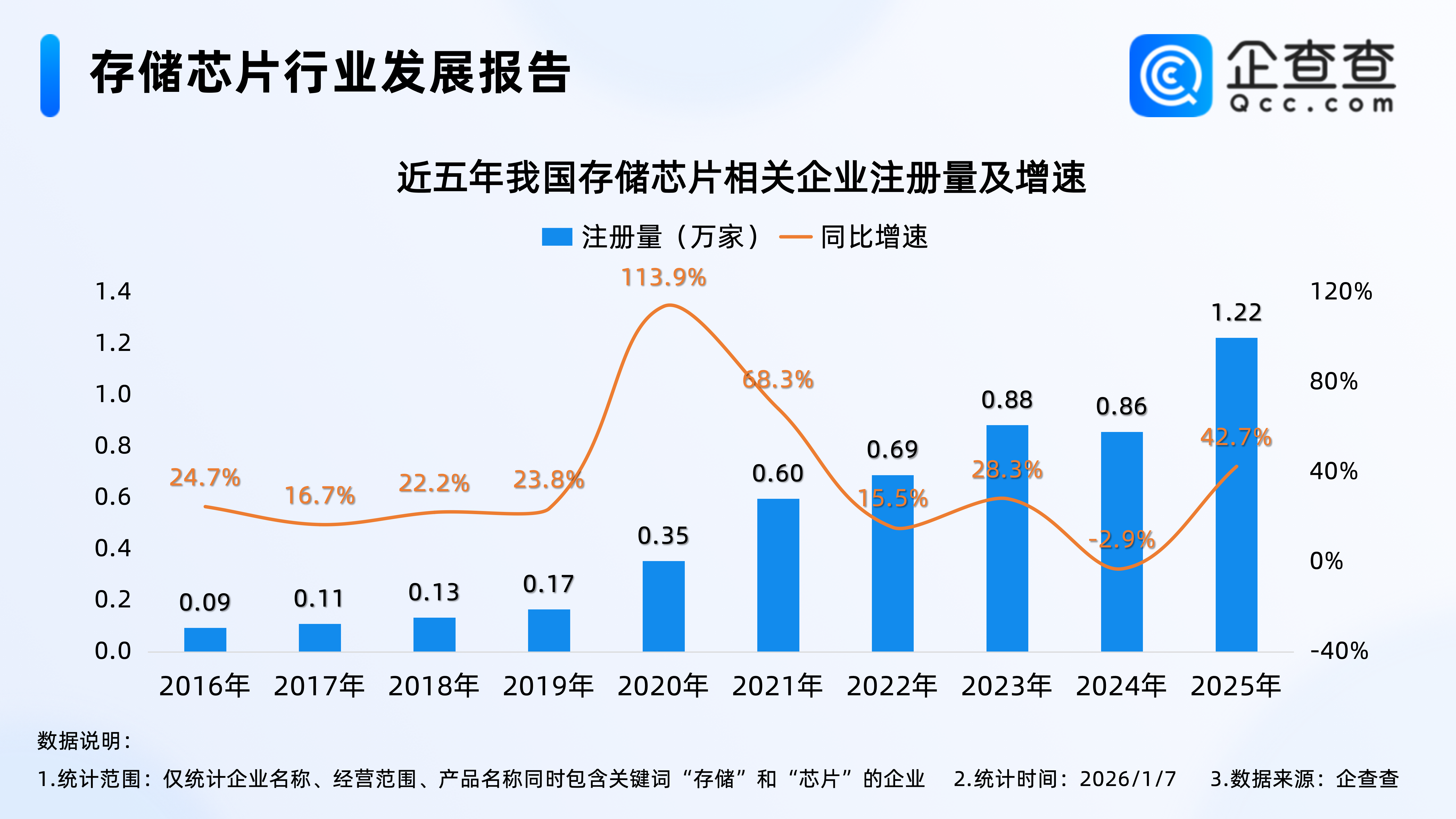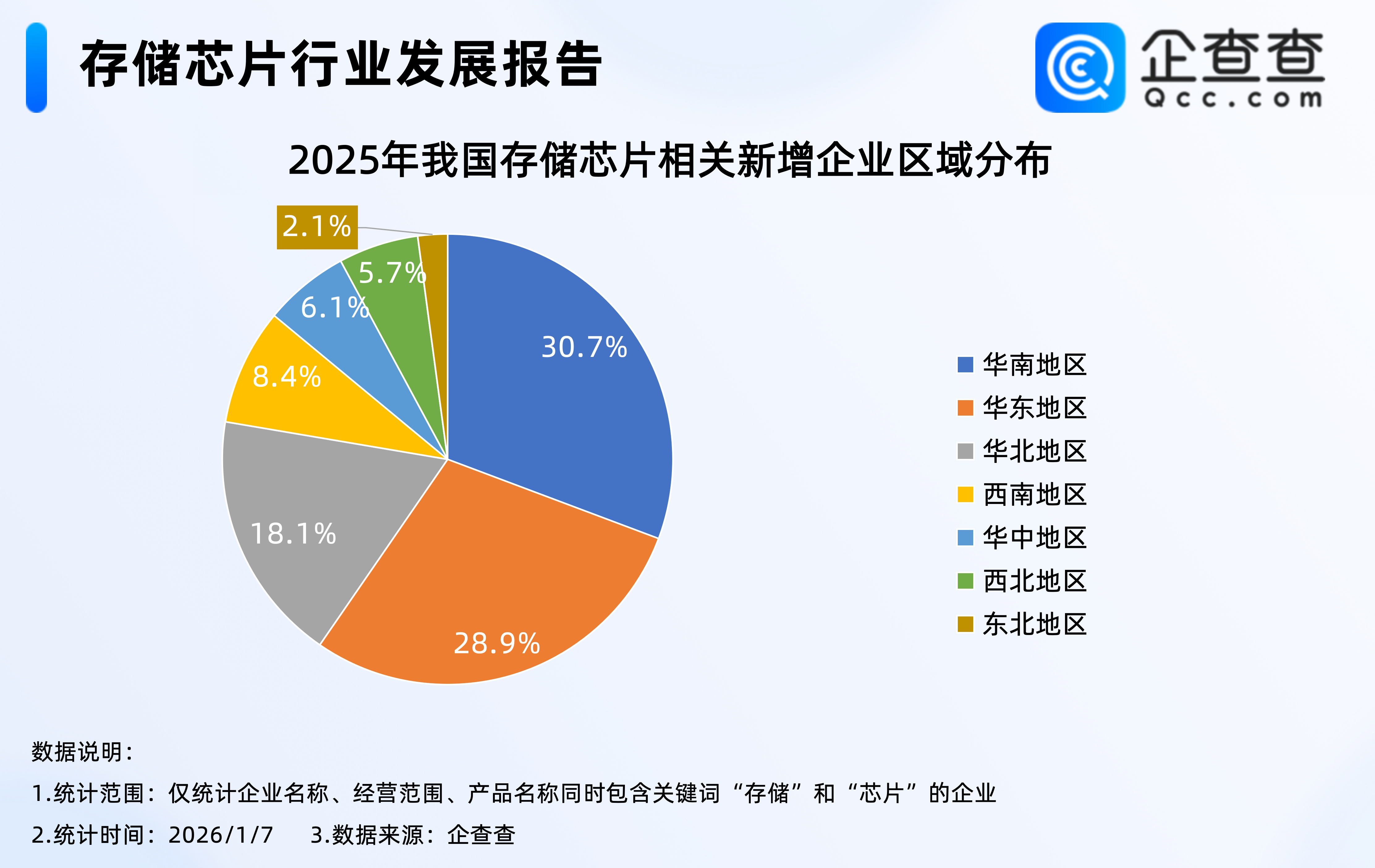 “1盒内存条堪比上海1套房”的热搜,揭开了AI时代存储芯片行业的涨价狂潮。据媒体报道,海力士和三星的256GDDR5服务器内存一根超过4万元,有的甚至高达49999元/根。如果按照1盒100根来计算,其价格将近500万元。有业内人士形容,其“价值已经超过上海不少房产。”,另外据报道,三星电子与SK海力士计划在2026年第一季度将服务器DRAM价格较2025年第四季度提升60%至70%。这场由技术革命催生的价格风暴,正让存储芯片成为全球科技产业最核心的价值高地。企查查数据显示,2025年全年,我国注册1.22万家存储芯片相关企业(仅统计企业名称、经营范围、品牌产品同时包含关键词“存储”和“芯片”的企业),同比增加42.7%,创近十年我国存储芯片相关企业注册量新高。新注册企业中,超三成企业位于华南地区,其次是华东地区,占比28.9%。企业存量方面,截至1月7日,我国现存4.6万家存储芯片相关企业,成立于近三年的企业合计占比56.7%。1.从注册量来看:2025年全年注册1.22万家相关企业